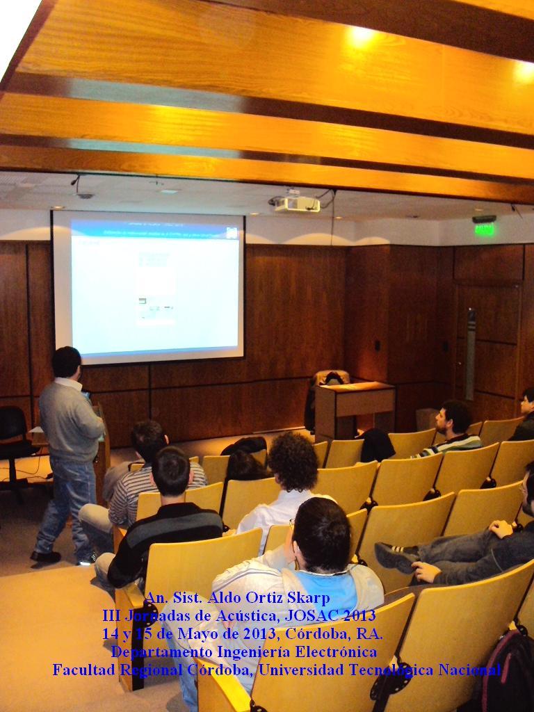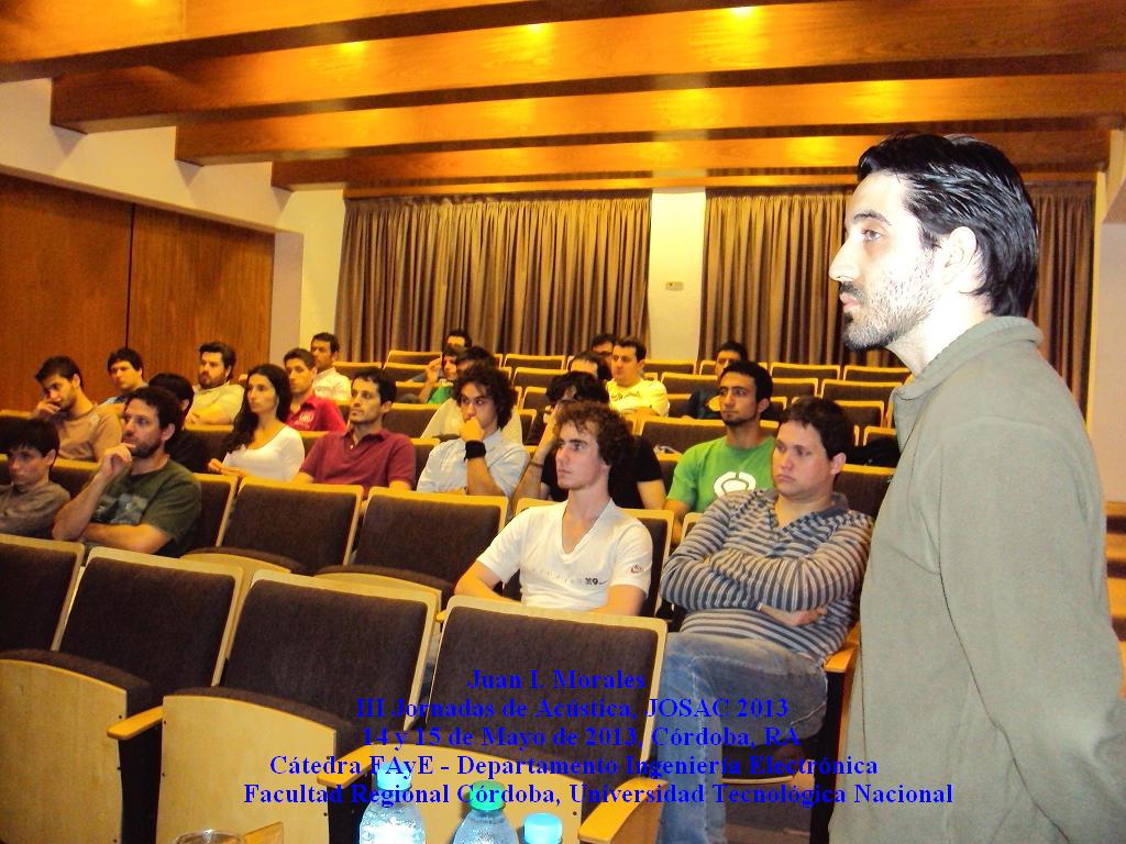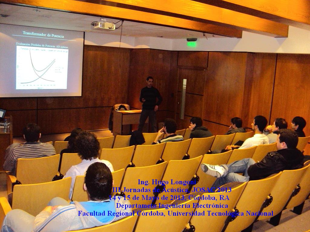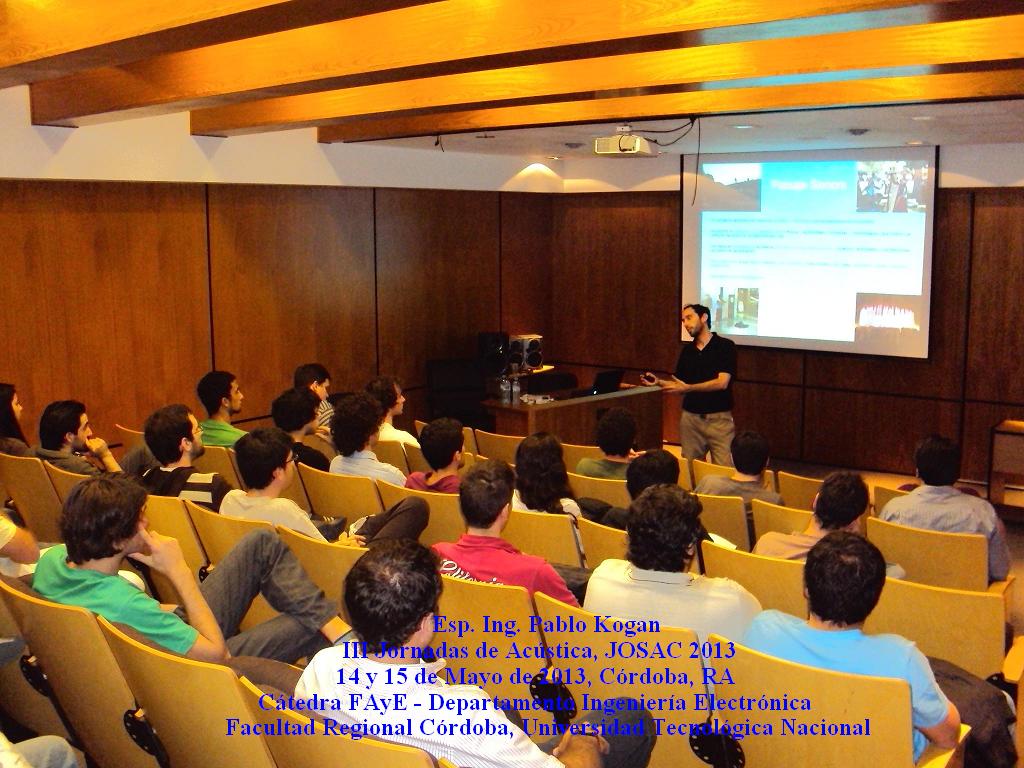 El pasado 14 y 15 de mayo del corriente, en el Salón de Usos Múltiples (SUM, 1º Piso Ed. Central) de esta Casa de Estudios, se realizaron las III Jornadas de Acústica (JOSAC 2013), organizadas por la cátedra Fundamentos de Acústica y Electroacústica, del Departamento Ingeniería Electrónica, Facultad Regional Córdoba, Universidad Tecnológica Nacional. El objetivo de la misma, es generar un espacio de interacción entre investigadores, docentes, profesionales y estudiantes (de diferentes carreras relacionadas con la acústica) con el fin de difundir y analizar avances científicos y tecnológicos de diferentes áreas de la acústica, articulando de esta manera ciencia & técnología, docencia y empresa. Las Jornadas fueron de carácter obligatorio para alumnos que cursan dicha asignatura y abierta a todos aquellos interesados en asistir. La inscripción fue vía e-mail a catedrasferreyra@gmail.com enviando nombre, apellido y DNI ya que el cupo fue limitado con entrada gratuita. A partir del 03/06/2013 se podrán retirar los certificados de asistencia en la Of. Nº 38 (CINTRA). Planta Baja, pasillo Ing. Taravella, Ed. Central, FRC UTN.