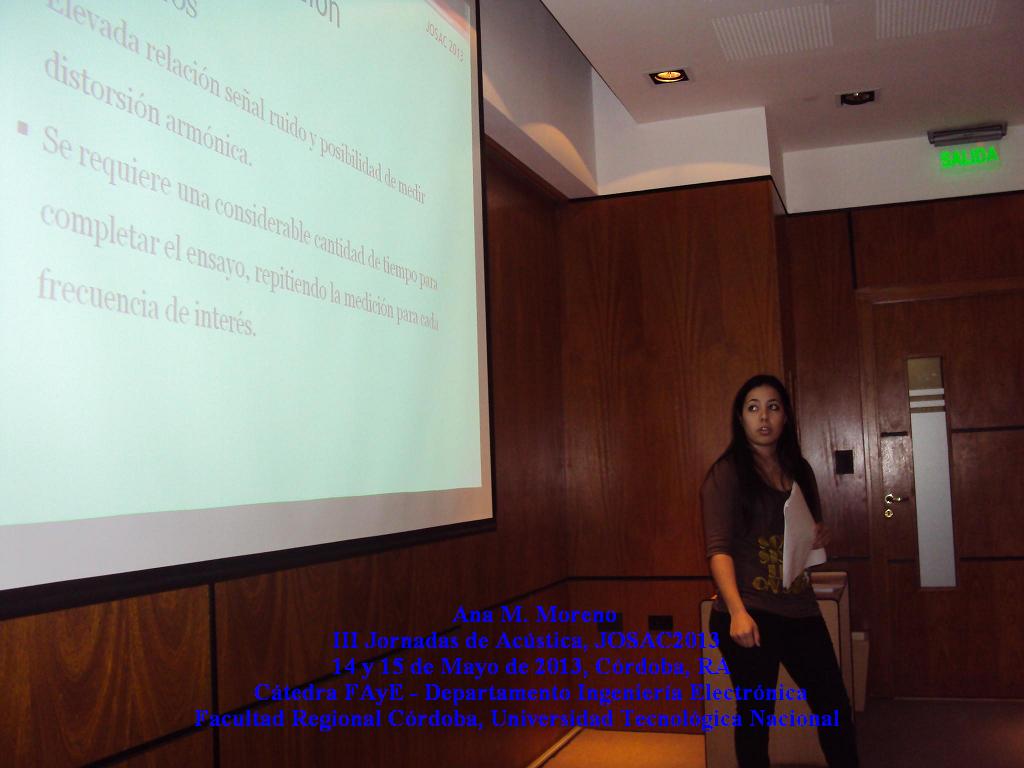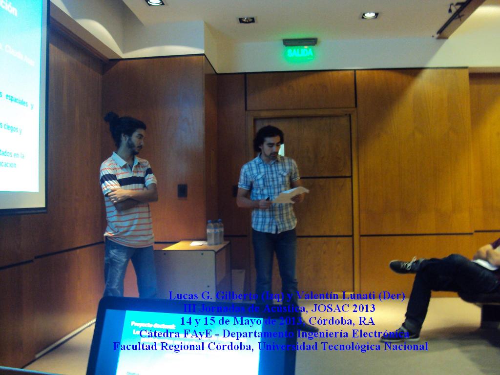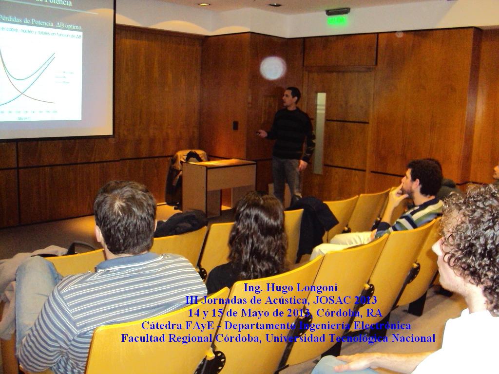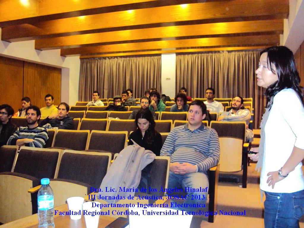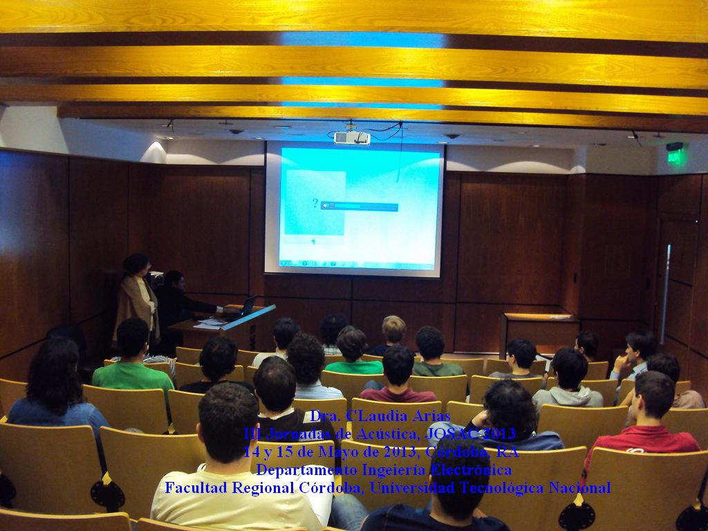 El pasado 14 y 15 de mayo del corriente, en el Salón de Usos Múltiples (SUM, 1º Piso Ed. Central) de esta Casa de Estudios, se realizaron las III Jornadas de Acústica (JOSAC 2013), organizadas por la cátedra Fundamentos de Acústica y Electroacústica, del Departamento Ingeniería Electrónica, Facultad Regional Córdoba, Universidad Tecnológica Nacional. El objetivo de la misma, es generar un espacio de interacción entre investigadores, docentes, profesionales y estudiantes (de diferentes carreras relacionadas con la acústica) con el fin de difundir y analizar avances científicos y tecnológicos de diferentes áreas de la acústica, articulando de esta manera ciencia & técnología, docencia y empresa. Las Jornadas fueron de carácter obligatorio para alumnos que cursan dicha asignatura y abierta a todos aquellos interesados en asistir. La inscripción fue vía e-mail a catedrasferreyra@gmail.com enviando nombre, apellido y DNI ya que el cupo fue limitado con entrada gratuita. A partir del 03/06/2013 se podrán retirar los certificados de asistencia en la Of. Nº 38 (CINTRA). Planta Baja, pasillo Ing. Taravella, Ed. Central, FRC UTN.
